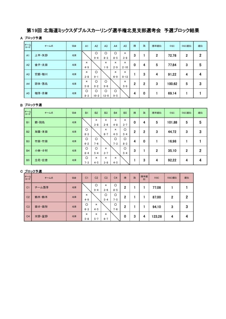 今月15日(土)と16日(日)に、北海道ミックスダブルスカーリング選手権北見支部選考会を行いました。結果は以下のとおりです。