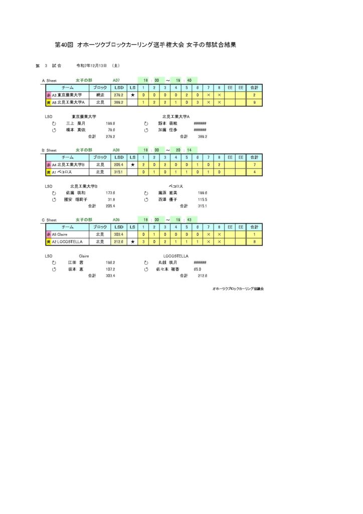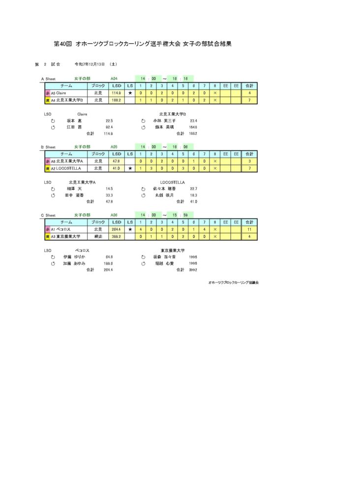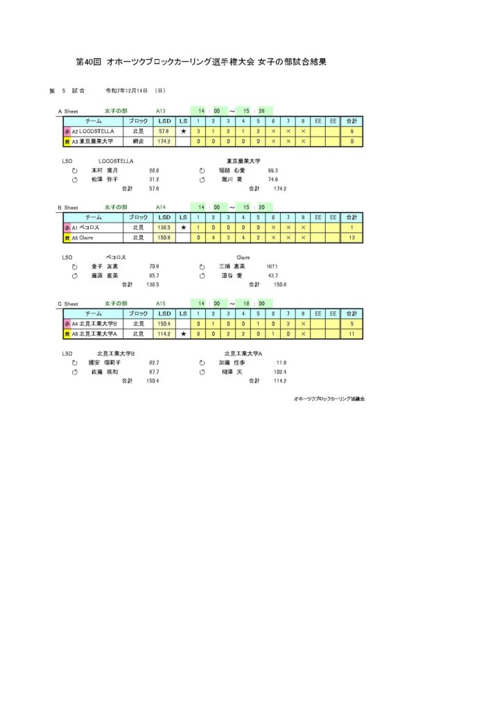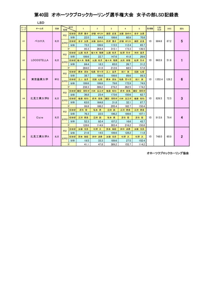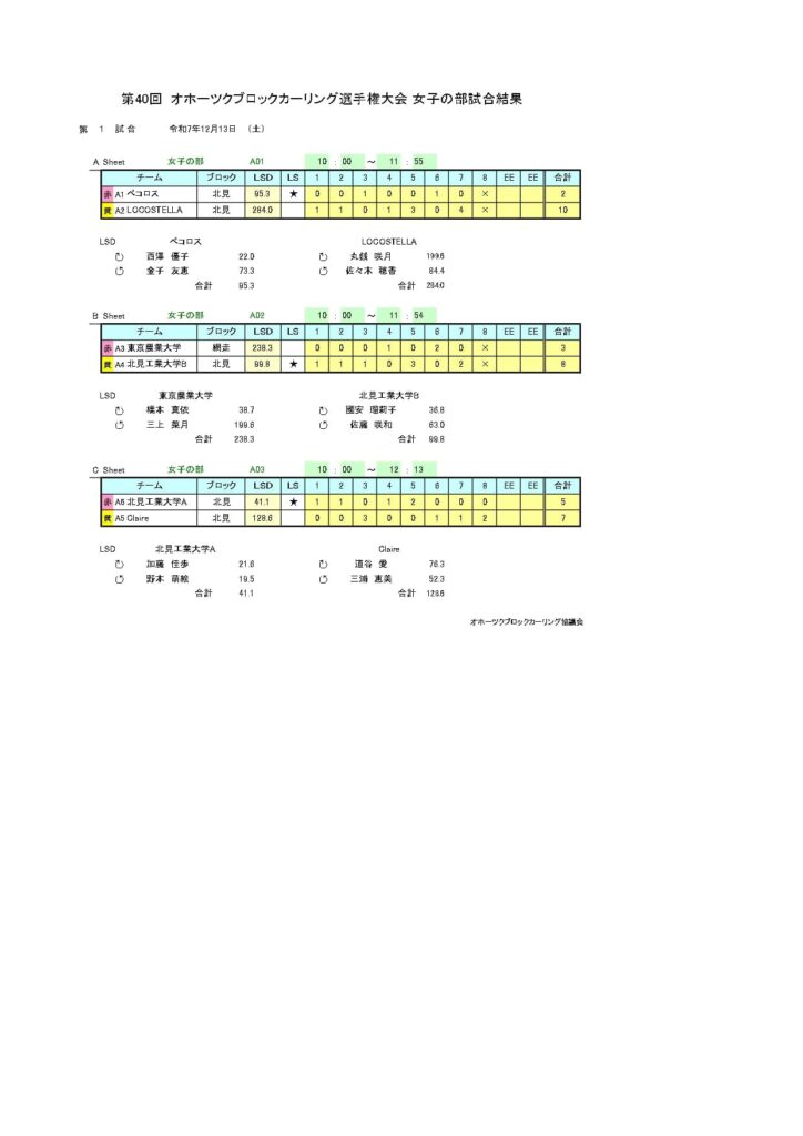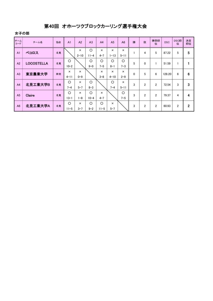 きのうまで、アルゴグラフィックス北見カーリングホールで「第40回オホーツクブロックカーリング選手権大会(女子の部)」を行いました。最終結果は以下のとおりです。
