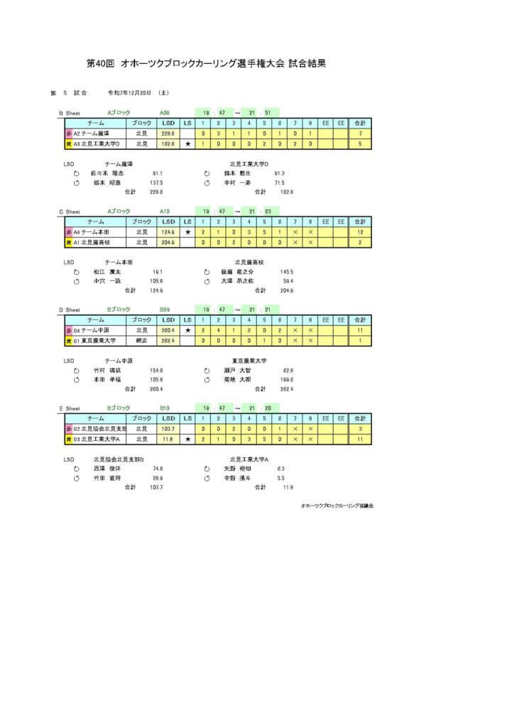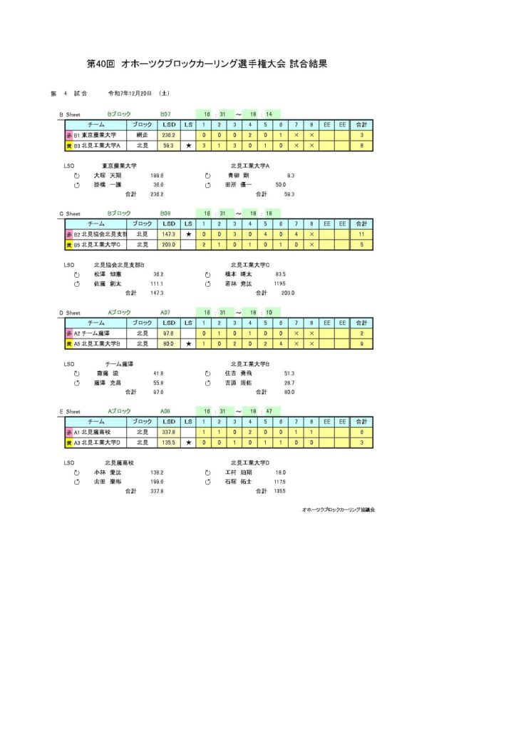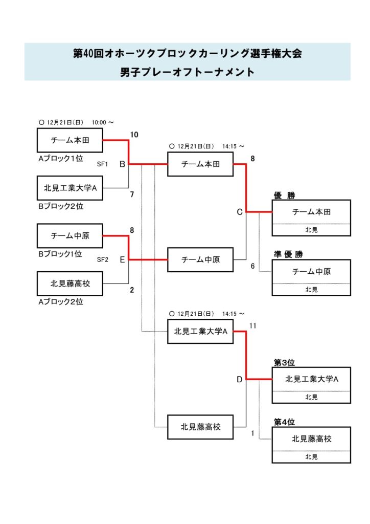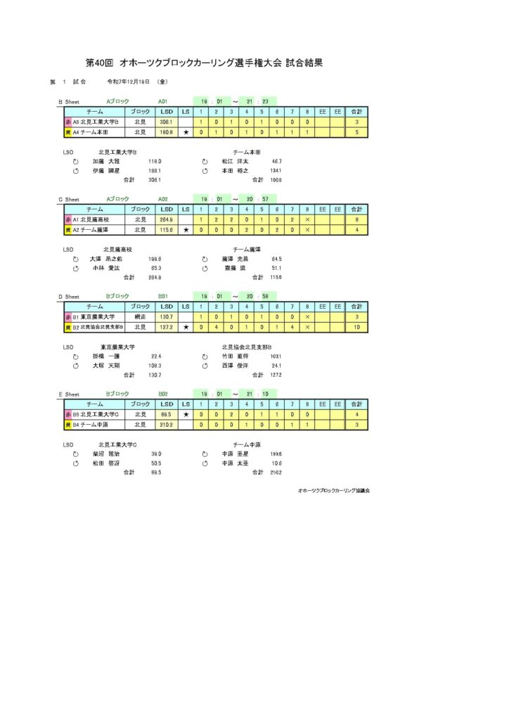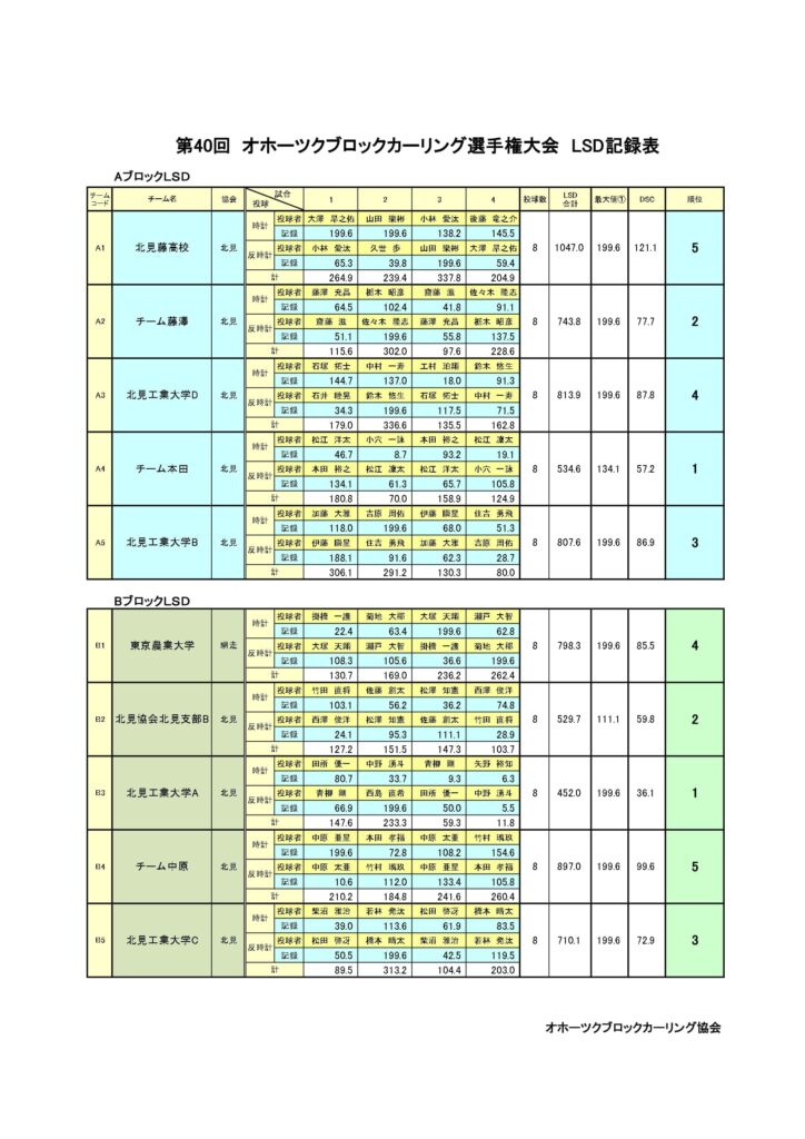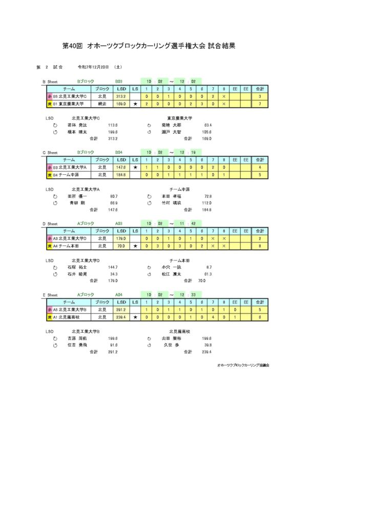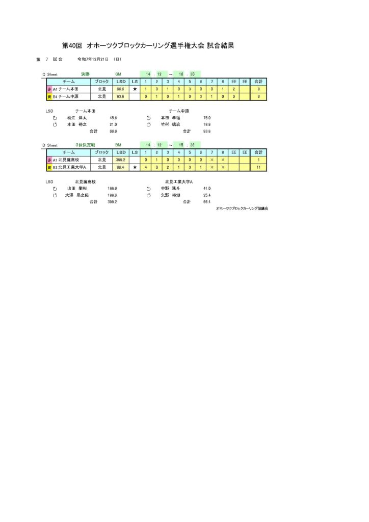 きのうまで、アドヴィックス常呂カーリングホールで「第40回オホーツクブロックカーリング選手権大会(男子の部)」を行いました。最終結果は以下のとおりです。