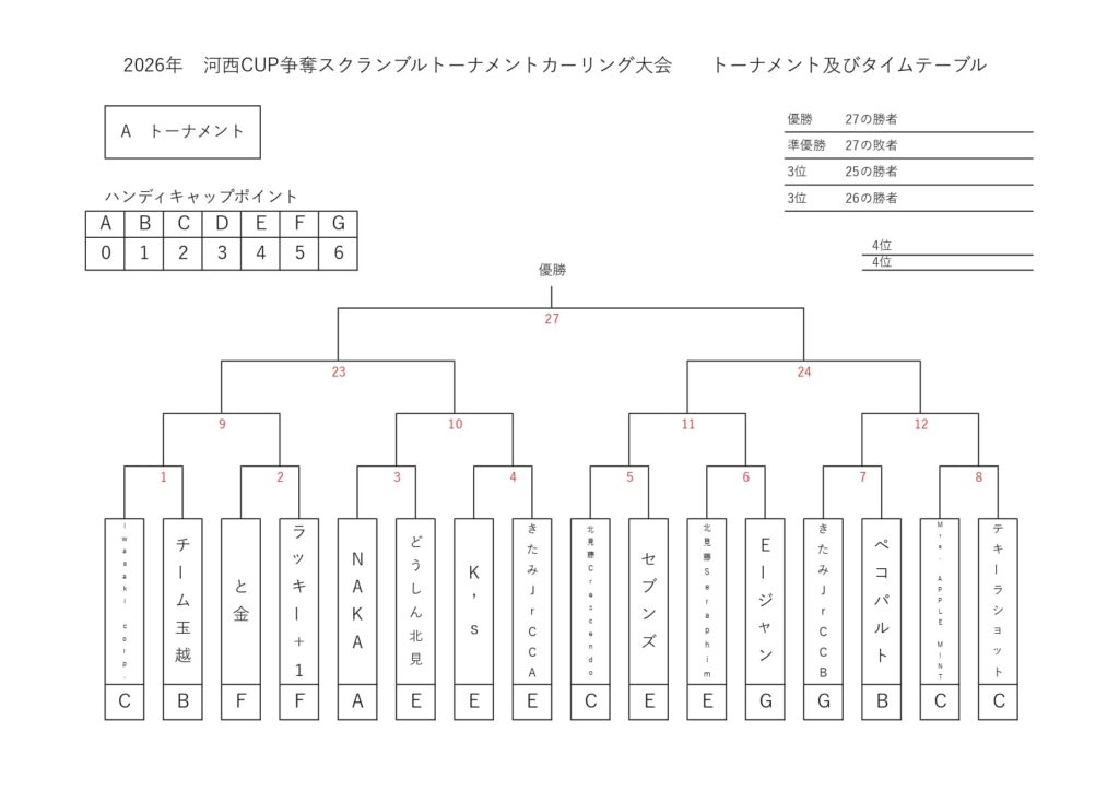「2026年 河西CUP争奪スクランブルトーナメントカーリング大会」の組み合わせは、公開抽選の結果、下記のとおりとなりました。16チームのご参加、ありがとうございます!